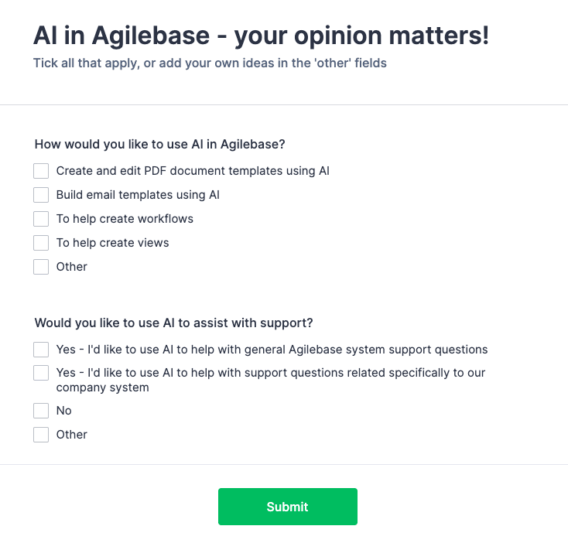 We welcome your input on where AI should go in Agilebase. Ideas on our list include: